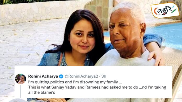 लहरि रूम (पटना) : लालू प्रसाद यादव के एक समय मे हुनका जरूरत परला पर किडनी डोनेट करय वाली बेटी रोहिणी आचार्य सोशल मीडिया प्लेटफॉर्म X पर पोस्ट क’ राजनीतिक खेमा मे हलचल मचा देलनि अछि। ओ बेबाक घोषणा केलनि जे ओ राजनीति छोड़ि अपन परिवार सं संबंध तोड़ि रहल छथि। ओ लिखलनि अछि जे, “मैं राजनीति छोड़ रही हूं और अपने परिवार से नाता तोड़ रही हूं। संजय यादव और रमीज ने मुझसे यही करने को कहा था और मैं सारा दोष अपने ऊपर ले रही हूं।”