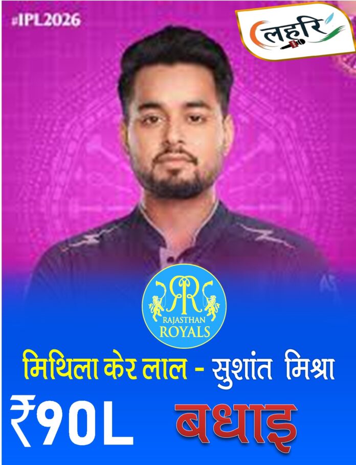 लहरि रूम (रांची ) : बामा हाथ स्पिन आ मिडयम पेसर गेंदबाज मैथिल पुत्र सुशांत मिश्रा के आईपीएल 2026 हेतु राजस्थान रॉयल टीम सँ ऑक्शन केँ क्रम मे चयन भेलनि अछि। सुशांत मिश्रा रांची मे रांची मे रहनिहार श्रीमान समीर कुमार मिश्रा जिक एकल सुपुत्र छथि। सुशांत मिश्र केर चयन सँ समस्त मिथिला केर मैथिल गौरवान्वित अछि।