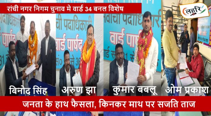लहरि रूम (रांची) : सम्पूर्ण झारखण्ड मे निगम चुनाव के तिथि के घोषणा भ’ चुकल अछि। रांची नगर निगम क्षेत्र मे नामांकन के प्रक्रिया प्रारम्भ भ’ चुकल अछि। रांची मे 53 वार्ड अछि। एहि मे सब सँ रोचक वार्ड 34 बनि गेल अछि। वार्ड 34 मे 25 टा बेसी प्रत्याशी लोकनि अपन भाग्य आजमा रहला अछि। मैथिल अभियानी सह वार्ड 26 के निर्वतमान पार्षद अरुण कुमार झा वार्ड 34 सँ अपन दावेदारी प्रस्तुत कयने छथि। पूर्व निवर्तमान पार्षद बिनोद सिंह चुकी एहि वार्ड सँ पार्षद छला ताहि हेतु हुनक त’ आधिकारिक अभिव्यक्ति छनि। बहुचर्चित नाम ओम प्रकाश सेहो एहि वार्ड सँ अहि अपन भाग्य आजमा रहला अछि। नव युवा कुमार बबलू सेहो अपन दावेदारी प्रस्तुत क’ रहला अछि।