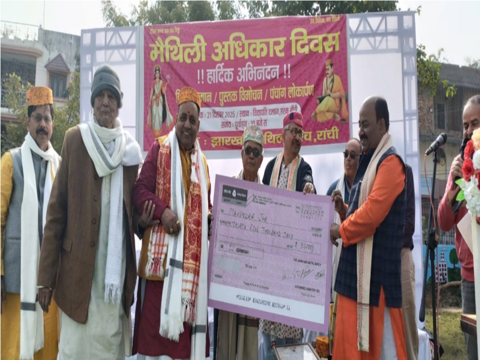 लहरि रूम (रांची ) : झारखंड मैथिली मंच , रांची केर तत्वावधान मे विद्यापति दलान, हरमू के सामने छठि तालाब परिसर मे एक संग अनेकों आयोजन कयल गेल। सम्पूर्ण कार्यक्रम मैथिली अधिकार दिवस केर समर्पित छल। पहिने मिथिलाक पारम्परिक धोती-कुर्ता परिधान मे सजल मंचक सदस्यक एकटा समूह विद्यापति दलान सँ मेन रोड पर कडरू मोर स्थित विद्यापति चौक धरि पद यात्रा करैत गेला , जतय ओतय स्थित बाबा विद्यापतिक मूर्ति केँ माल्यार्पण क’ श्रद्धा सुमन अर्पित कयलनि ।