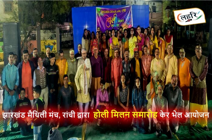 लहरि रूम (रांची) : झारखंड मैथिली मंच रांची के तत्वावधान मे विद्यापति दलान के सामने छठि तालाब परिसर मे रंगारंग होली मिलन समारोहक आयोजन कयल गेल | कार्यक्रम केर शुभआरम्भ विद्यापति द्वारा रचित भगवती वंदना (भगवती वंदना) “जय जय भैरवी असुर भयावनी” गोसोवणी गीत आ राष्ट्रगान के गायन सँ भेल। महासचिव जयंत कुमार झा अतिथि आ सदस्यक स्वागत केलनि । एहि केर उपरांत विशिष्ट अतिथि, जाहि मे आईआईसीएम के सेवानिवृत्त प्रमुख डॉ. प्रभाष चंद्र मिश्रा, दूरदर्शन, रांची के निदेशक अमित कुमार, बैंक ऑफ महाराष्ट्र के क्षेत्रीय प्रबंधक शीषा चौधरी, आ झारखंड मैथिली मंच के महासचिव जयंत कुमार झा, सहित अन्य लोकनि सामूहिक रूप सँ विद्यापतिक चित्र पर अबीर आ गुलाल अर्पित क’ होली मिलन कार्यक्रमक शुभ आरम्भ कयलनि।